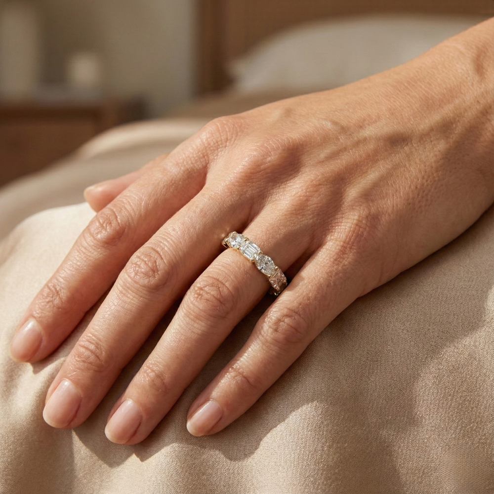 Amara brings a modern edge to timeless design, featuring a striking mix of emerald and oval cut lab-grown diamonds. Set in 14K solid gold, this 2.0 carat eternity band combines clean step-cut facets with soft oval brilliance for a look that’s both contemporary and elegant.