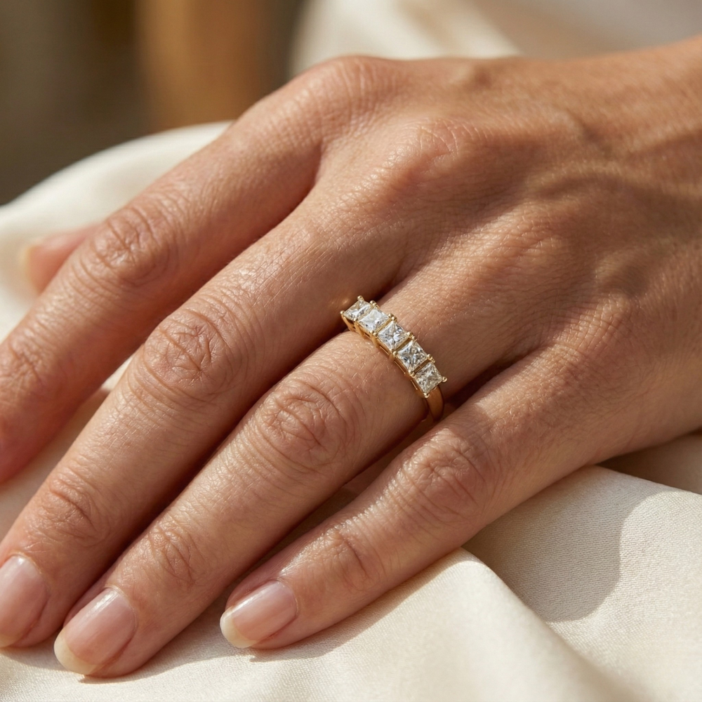 Celebrate your love with Amoura, a striking anniversary ring that embodies modern elegance and timeless beauty. Handcrafted in 14K solid gold, Amoura showcases a row of princess cut lab-grown diamonds, prized for their clean lines, brilliant sparkle, and ethical origins. Each diamond features VS–VVS clarity and E/F color, offering radiant brilliance in a sustainable design.