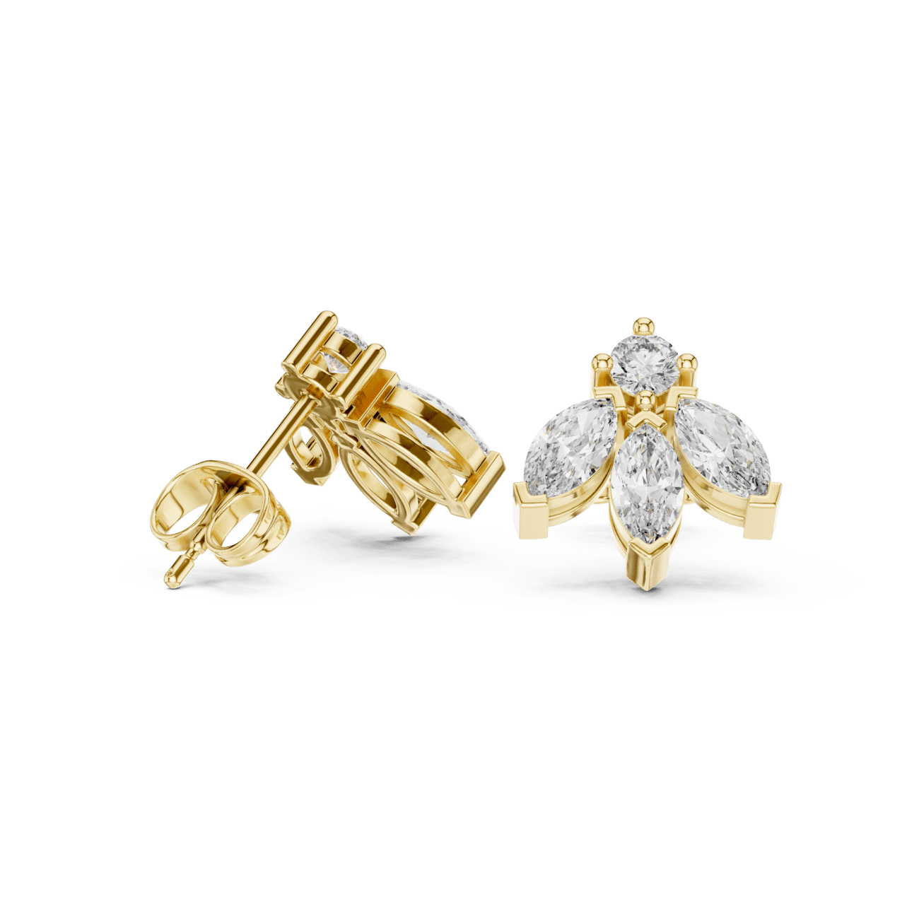 Dembia by Jewel Nests showcases three marquise cut lab-grown diamonds totaling approximately 1.30 carats, with bright E/F color and VS-VVS clarity, securely set in distinctive V-prong settings for dramatic sparkle and movement in premium fine jewelry diamond earrings. These marquise & Round Diamond Earrings and Marquise Cut Earrings are available in 14K and 18K solid Yellow Gold, White Gold, or Rose Gold, offering romantic sophistication perfect for evening wear, bridal looks, or confident everyday statements.