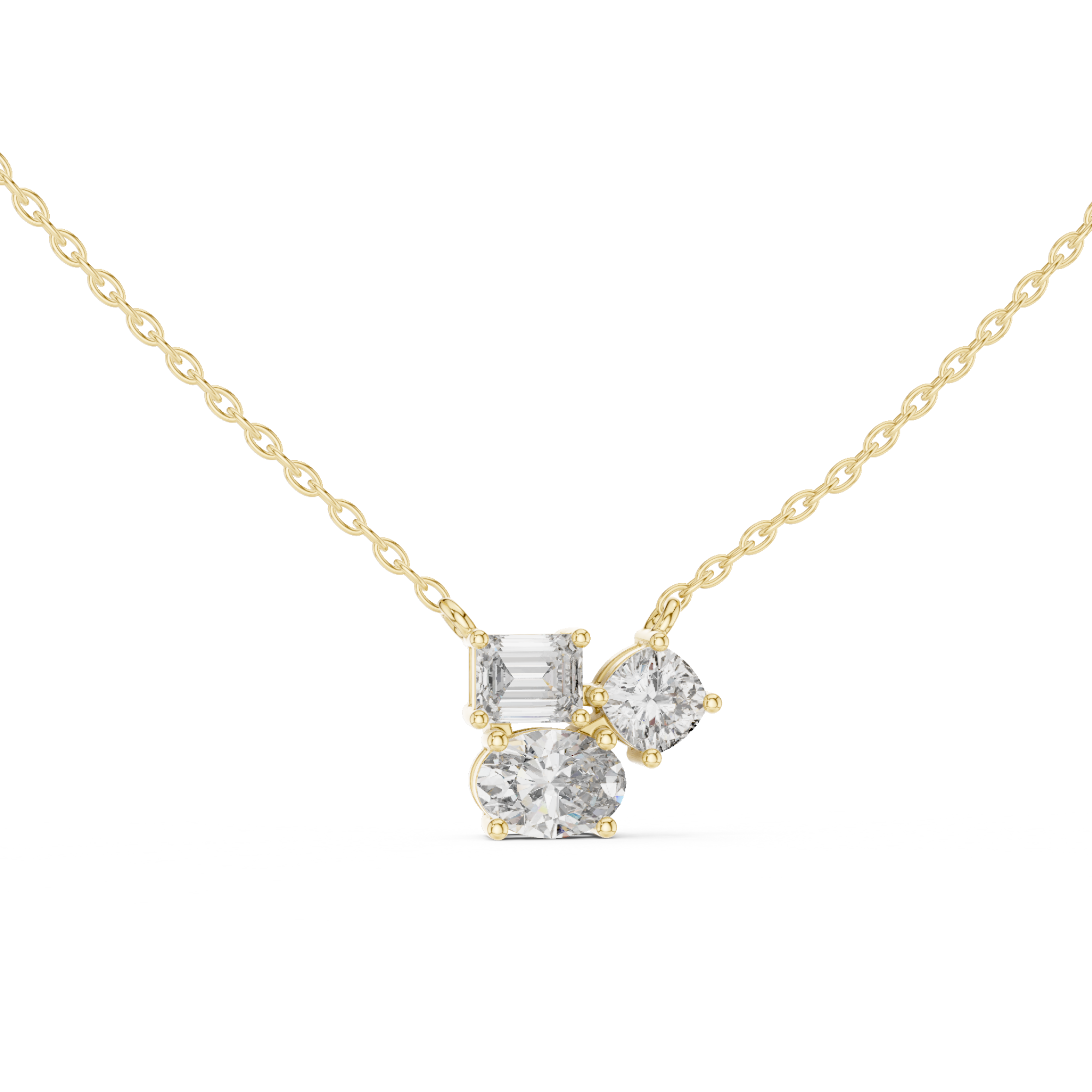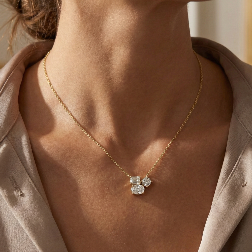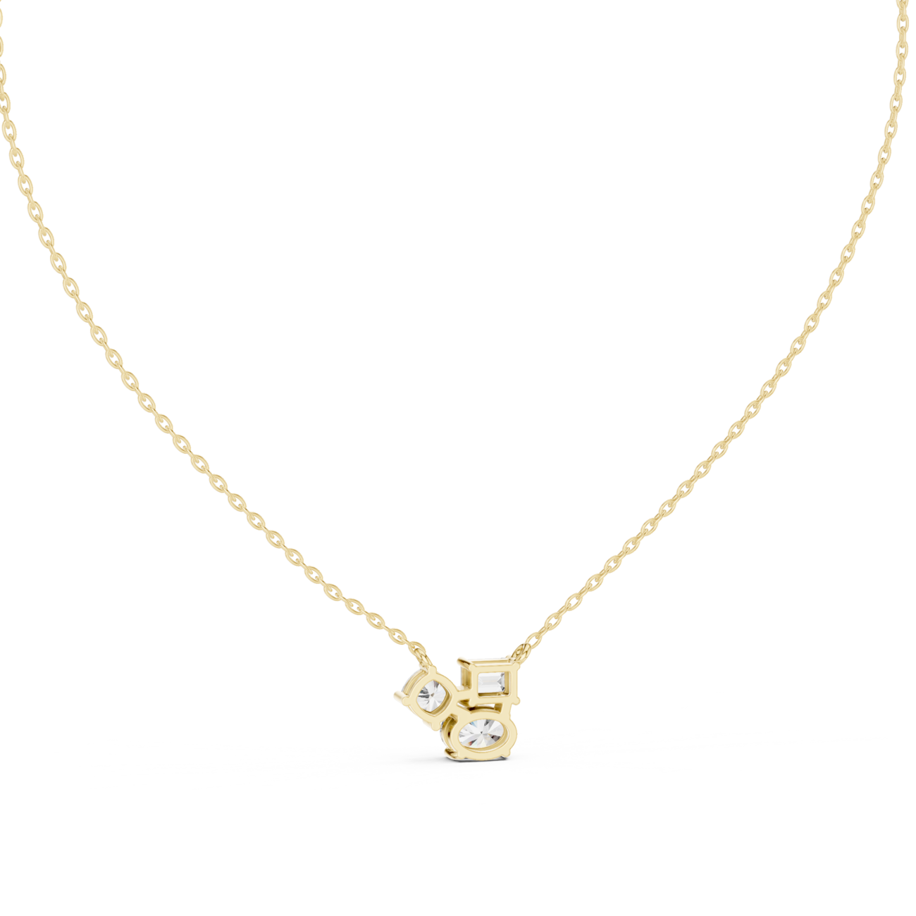 Elodie by Jewel Nests showcases three precisely matched 0.50-pointer lab-grown diamonds—a cushion cut, emerald cut, and oval cut—all with E/F color and VS-VVS clarity, creating dynamic contrast in this solitaire necklace. Suspended from a solid gold chain (1.30–1.50 mm width, adjustable 16–20 inches) in 14K or 18K Yellow Gold, White Gold, or Rose Gold, this three stone solitaire diamond necklaces delivers superior sparkle through the best combination of cushion, emerald, and oval cut diamond pendant design.