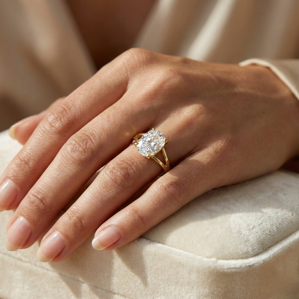 As part of the Jewel Nests D2C fine jewelry line, the Lisbon Glimmer Hidden Halo Elongated Cushion Cut Diamond Ring merges eco-conscious lab-grown brilliance with design excellence. Crafted using conflict-free diamonds and sustainable metals, it embodies the harmony of love, luxury, and responsibility. Every Elongated Cushion hidden halo engagement ring from Jewel Nests is a celebration of lasting beauty and ethical commitment.