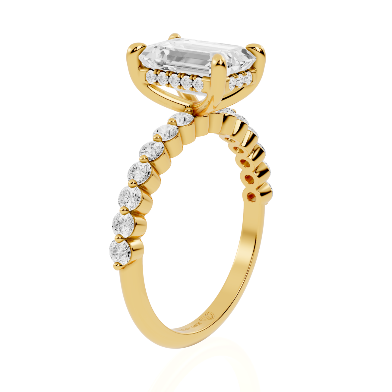 Emerald Cut Hidden Halo Lab Diamond Engagement Ring | Leipzig Echoes by Jewel Nests is a radiant symbol of elegance, precision, and modern craftsmanship — created for couples across Canada and the United States who value ethical luxury with timeless design. This exquisite Hidden halo diamond ring features a certified Emerald cut lab grown diamond, set in a refined four-prong setting that enhances its step-cut facets and mirror-like brilliance. A delicate hidden halo brings a soft luminous glow beneath the center stone, while the 2.0 mm bubble pavé band — adorned with round cut lab grown diamonds — adds a touch of contemporary sparkle to this refined silhouette.