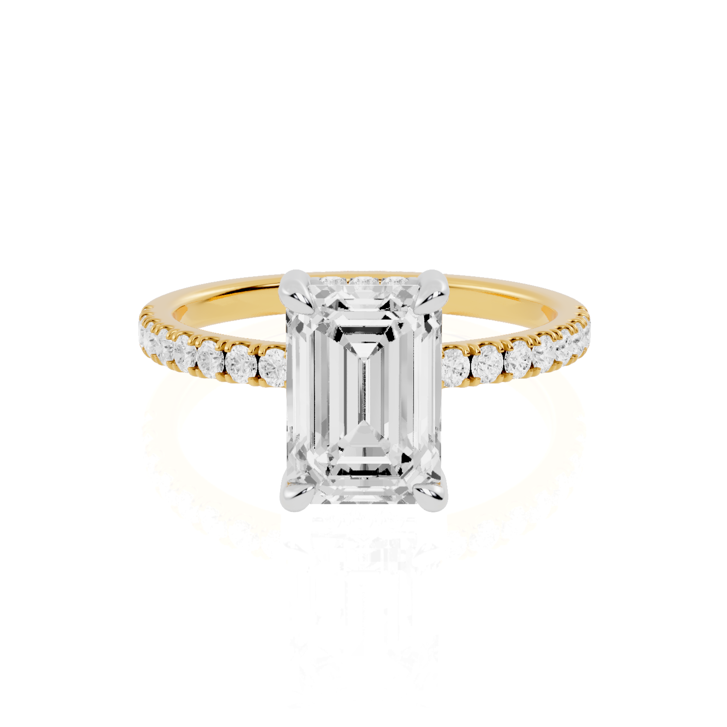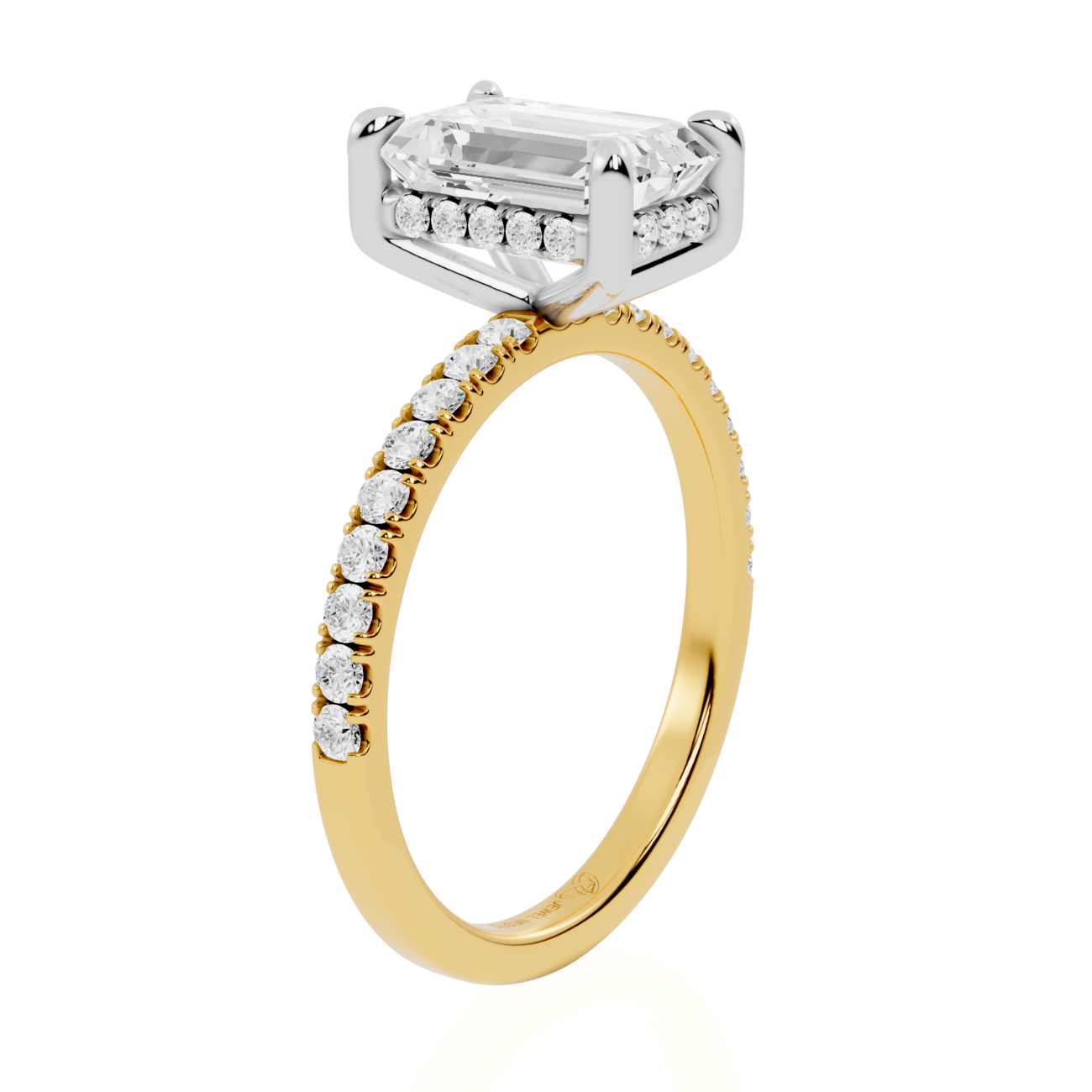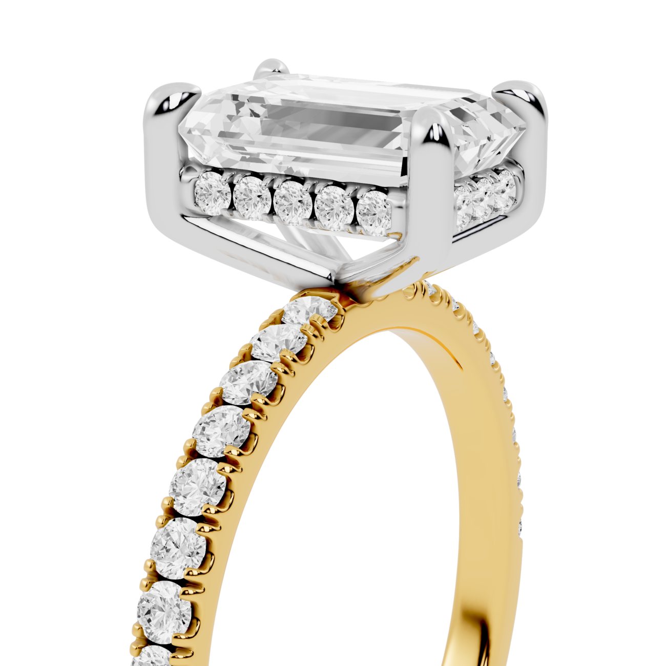 Emerald Cut Hidden Halo Lab Diamond Engagement Ring | Bruges Echo by Jewel Nests blends timeless design with modern artistry, crafted for couples across Canada and the United States who value ethical luxury and refined beauty. This exquisite Hidden halo diamond ring features a certified Emerald cut lab grown diamond, securely held by elegant four claw prongs that enhance its symmetry and brilliance. A luminous hidden halo adds subtle radiance beneath the center stone, while the chic 2.0 mm pavé band sparkles gracefully across a contemporary two-tone gold setting, giving this ring a balanced mix of classic elegance and bold contrast.