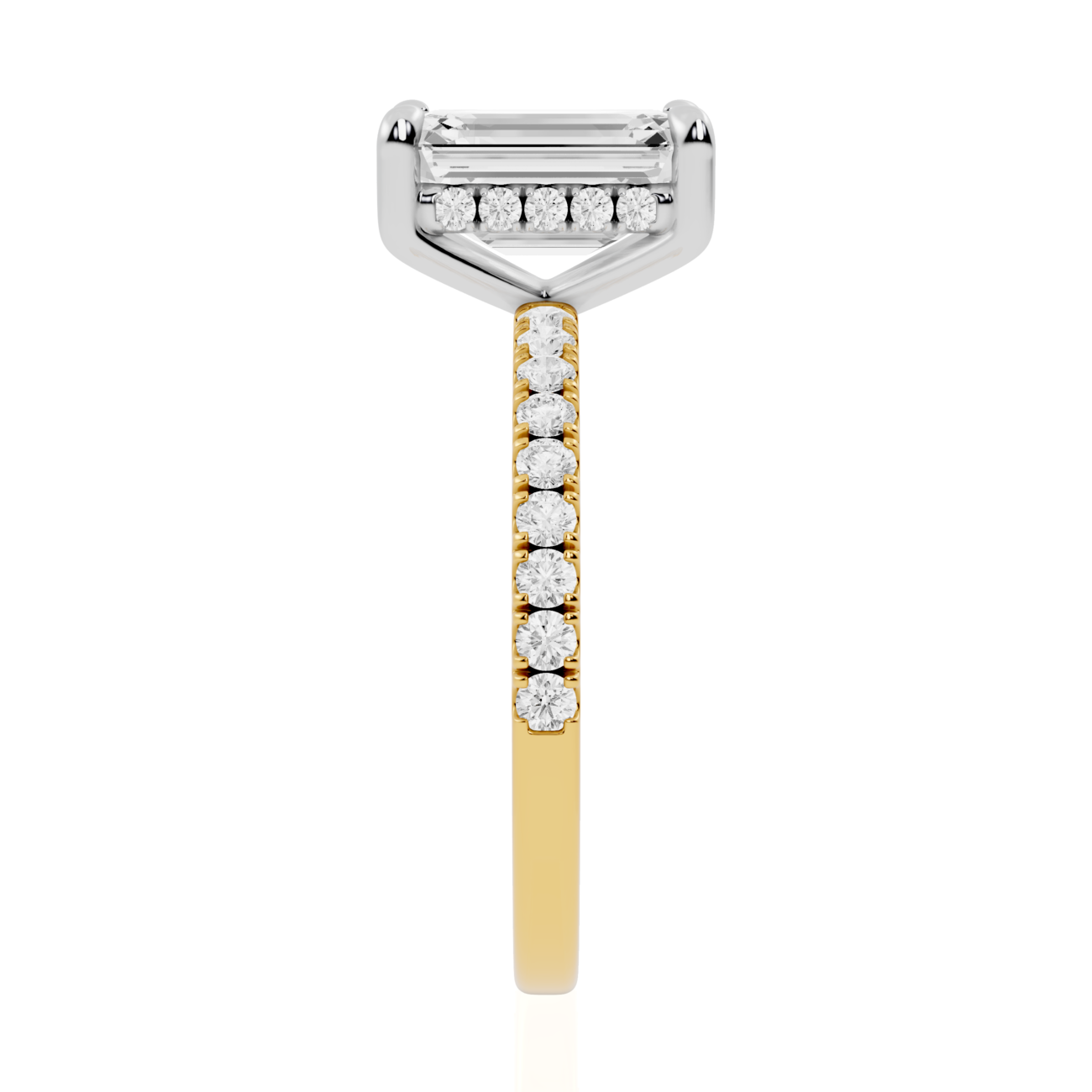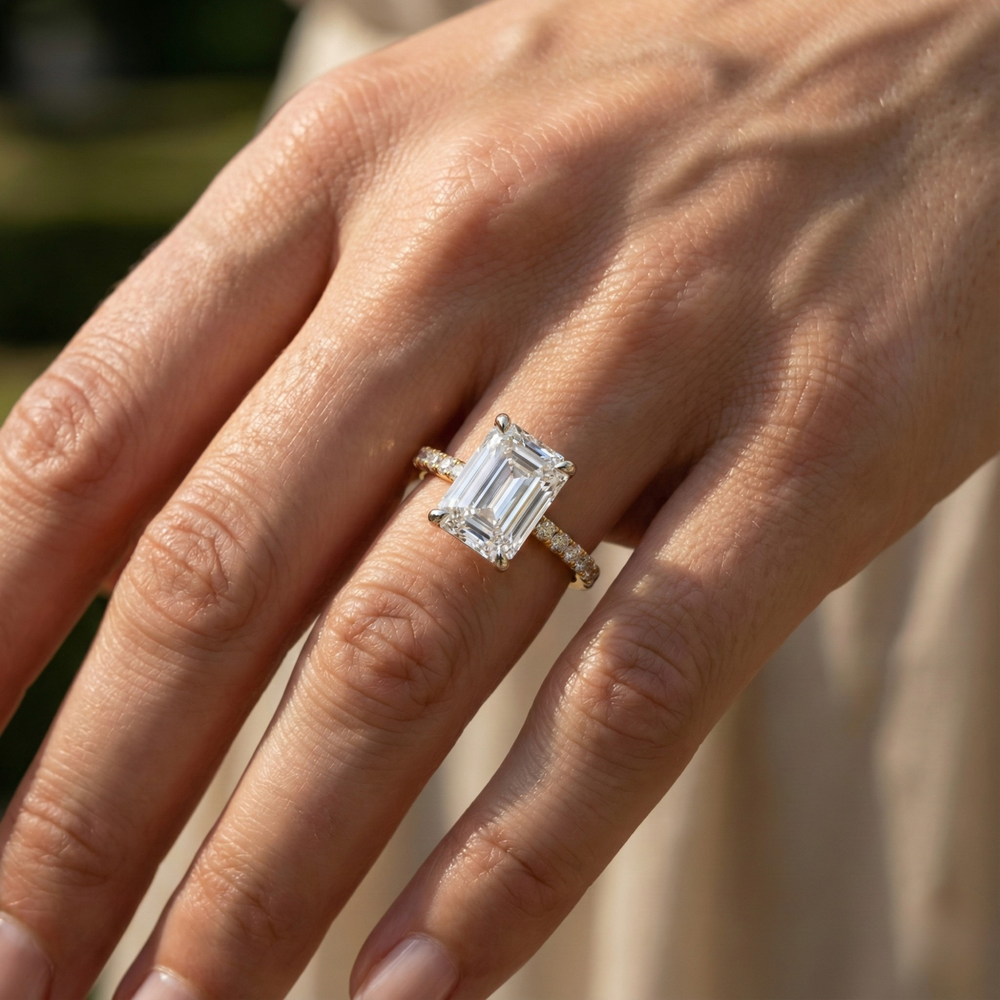 Meticulously crafted in Canada, this Hidden Halo Engagement ring is available in 14K or 18K Solid Yellow Gold, White Gold, Rose Gold, and Platinum, offering versatile styling options. The Emerald lab diamond ring showcases clean geometry and timeless sophistication, while the Hidden halo Emerald Cut Diamond Ring emphasizes the natural sparkle of the emerald cut’s step facets. The Emerald hidden halo pavé band engagement ring design enhances light reflection and pairs beautifully with the architectural precision of the split pavé band. The result is a Pavé Band Engagement Ring that embodies craftsmanship, elegance, and sustainable brilliance.