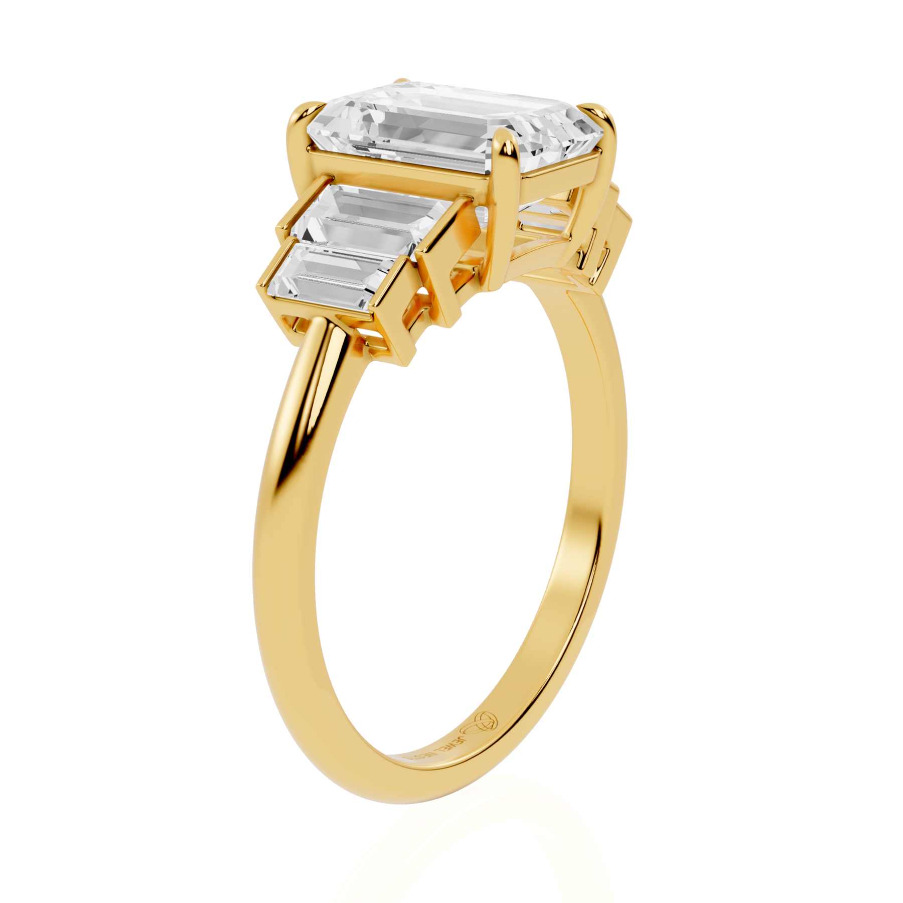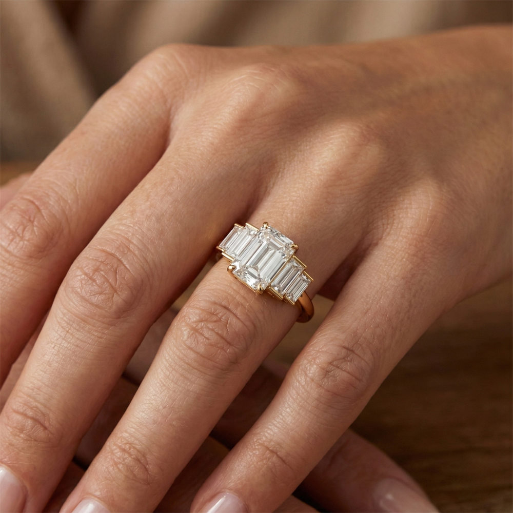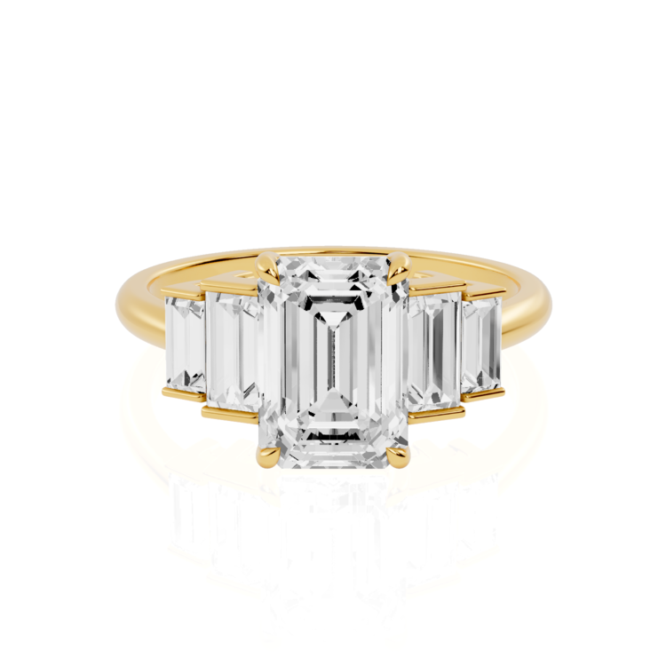 Emerald Cut With Side Stone Lab Diamond Ring | New York Spark by Jewel Nests captures timeless glamour with a modern edge, designed for fashion-forward couples across Canada and the United States who adore bold elegance and sustainable luxury. This striking Five diamond ring showcases a certified Emerald Cut lab grown diamond at its center, secured with four claw prongs for ultimate brilliance. Flanked by four baguette-cut side stones in a sleek bar setting, this Five Stone Engagement Ring delivers stunning symmetry and balance. Its clean lines, enduring sparkle, and refined geometry make it one of the most trendy engagement rings in Toronto and beyond.