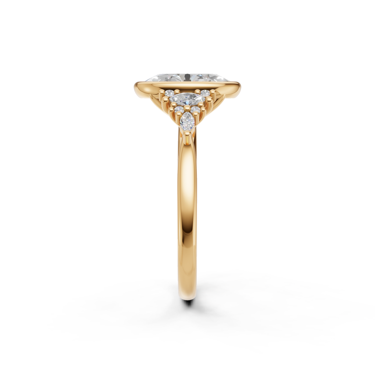 The Lotus Veil from Jewel Nests Premium Collection is a true expression of modern craftsmanship and timeless beauty. This handcrafted engagement ring features a mesmerizing bezel set oval lab grown diamond, delicately accented by marquise and melee round diamonds, all set in rich 14K solid yellow gold. Designed for the bride who values artistry and sustainability, the Lotus Veil radiates elegance from every angle.