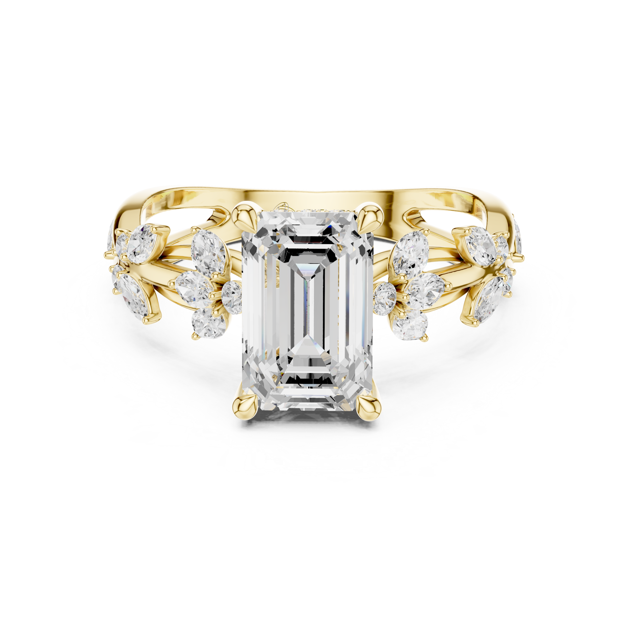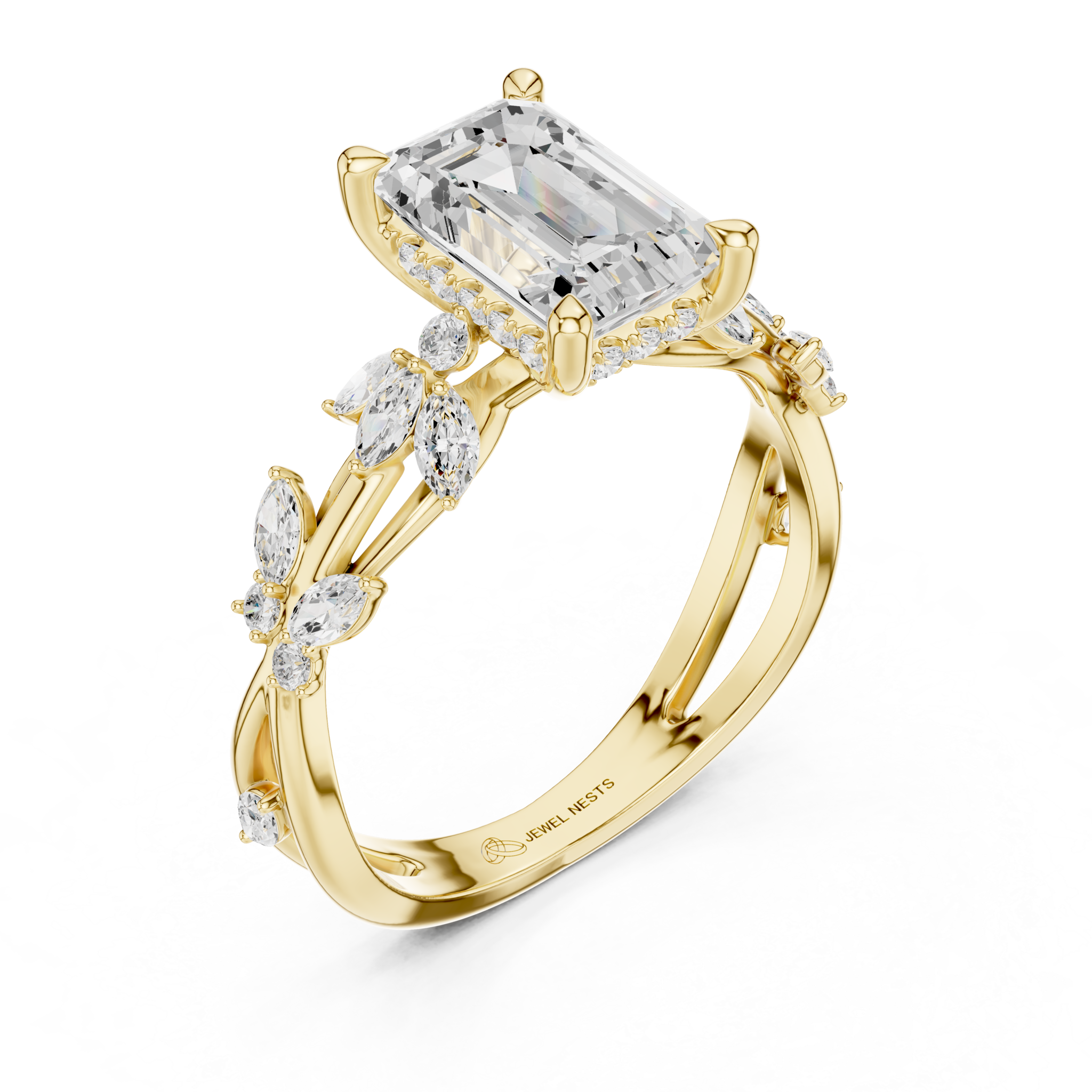 Emerald Cut Lab Diamond Engagement Ring | The Yukon Flow by Jewel Nests, Graceful, organic, and timeless — the Yukon Flow by Jewel Nests embodies the essence of natural beauty with modern sophistication. This exquisite Emerald Cut Diamond Engagement Ring features a stunning emerald lab-grown diamond, expertly held in four claw prongs for maximum brilliance and symmetry. The design is enriched with a leaf-style band adorned with delicate marquise diamonds, creating a poetic flow that beautifully captures the essence of nature-inspired engagement rings and effortless elegance.