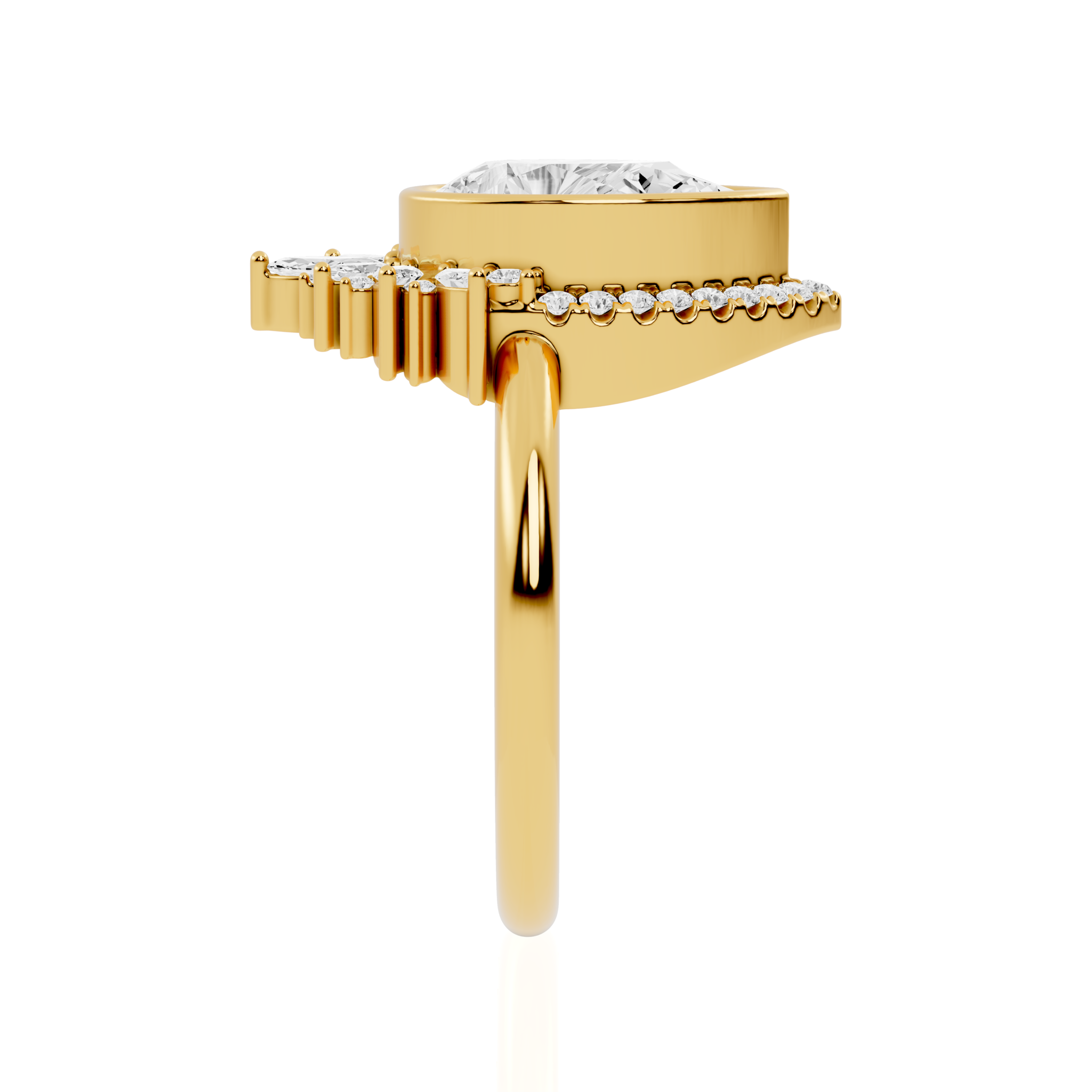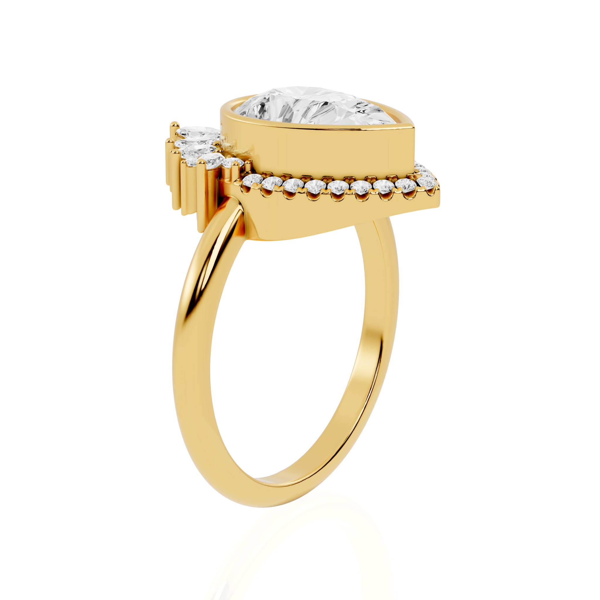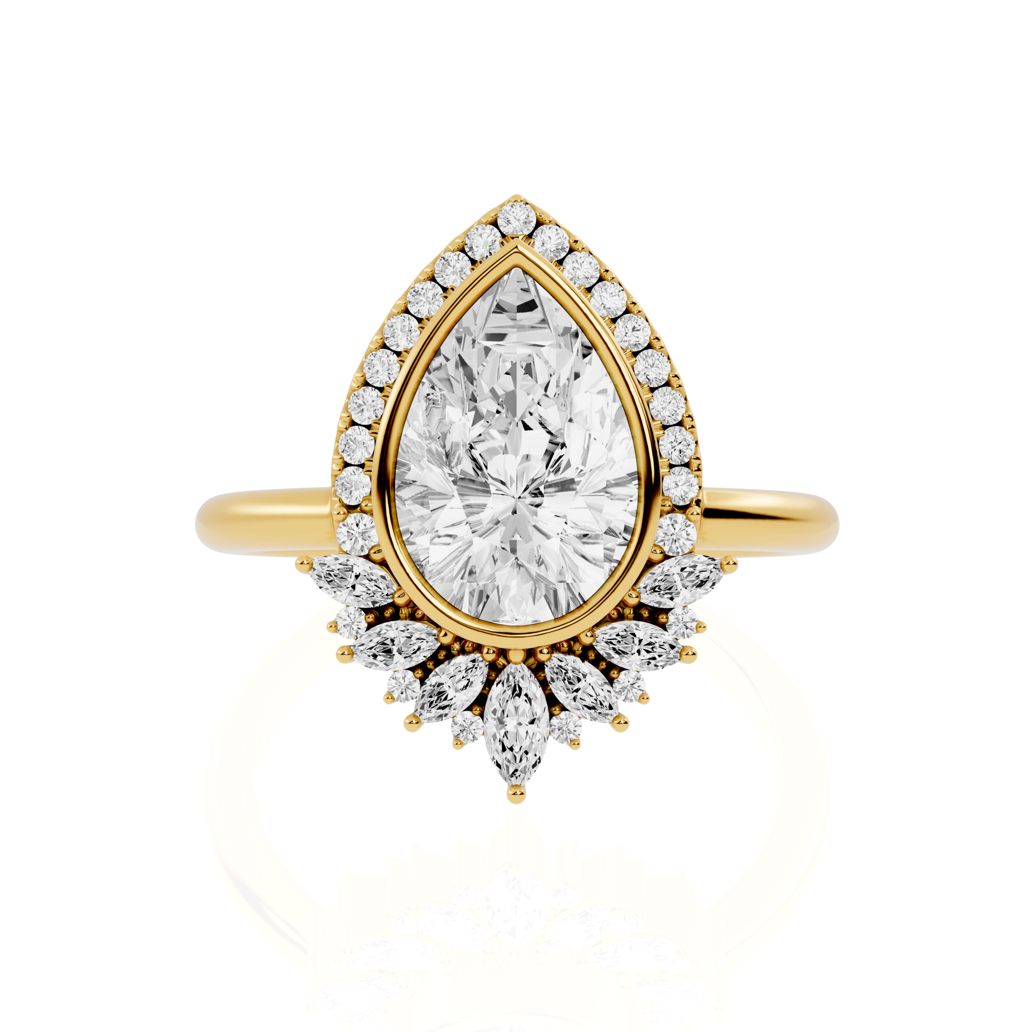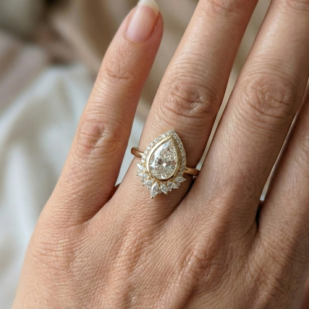 Pear Cut Lab Diamond Engagement Ring | The Teesta Flow by Jewel Nests, Flowing with organic beauty and timeless elegance, the Teesta Flow by Jewel Nests embodies the spirit of nature-inspired luxury. This captivating Pear Cut Diamond Engagement Ring features a brilliant pear lab-grown diamond, perfectly secured in a modern bezel setting to enhance its shape and sparkle. Surrounding the center stone, a delicate halo of marquise and round diamonds evokes the soft movement of petals in bloom — beautifully fusing art, form, and emotion for those who cherish nature-inspired engagement rings.