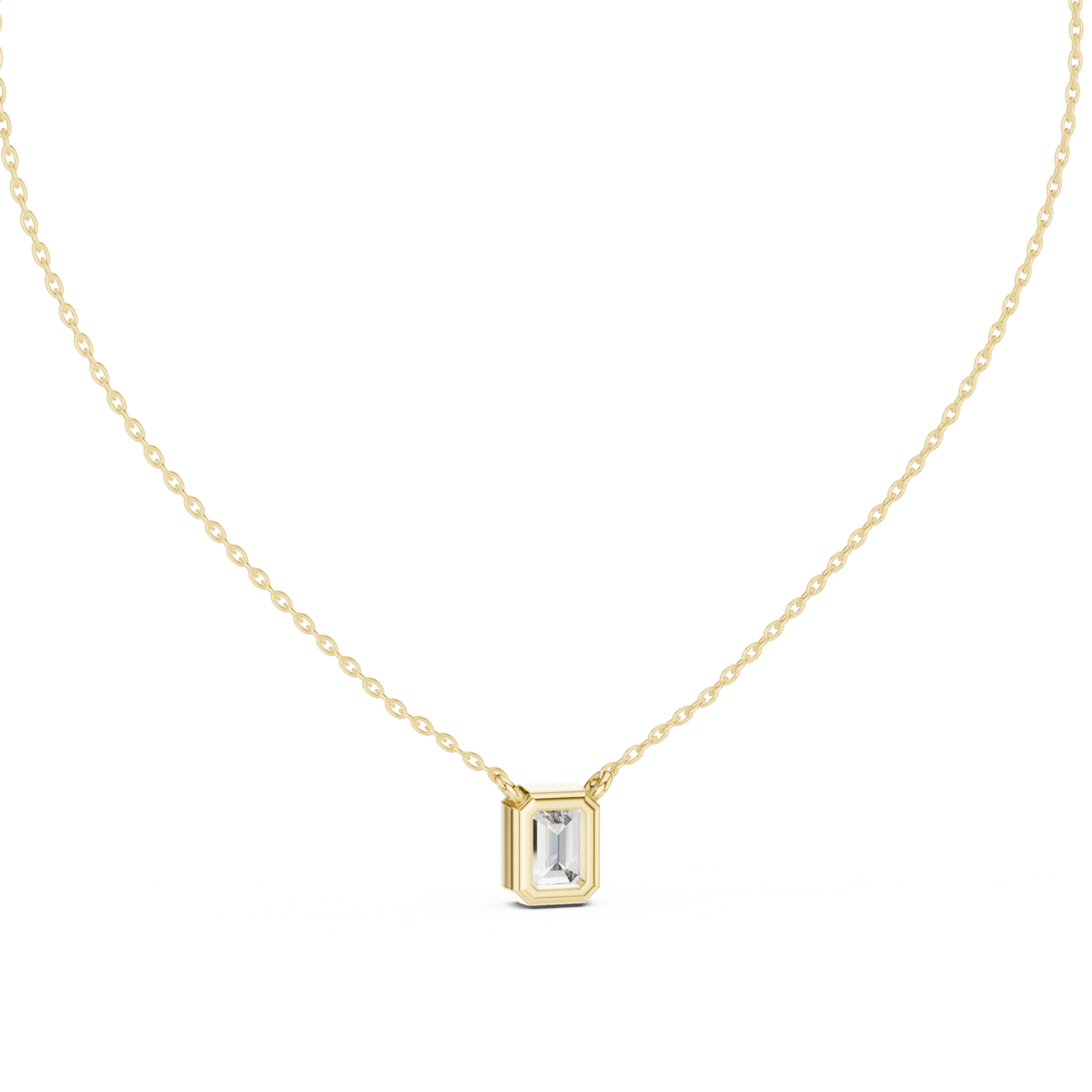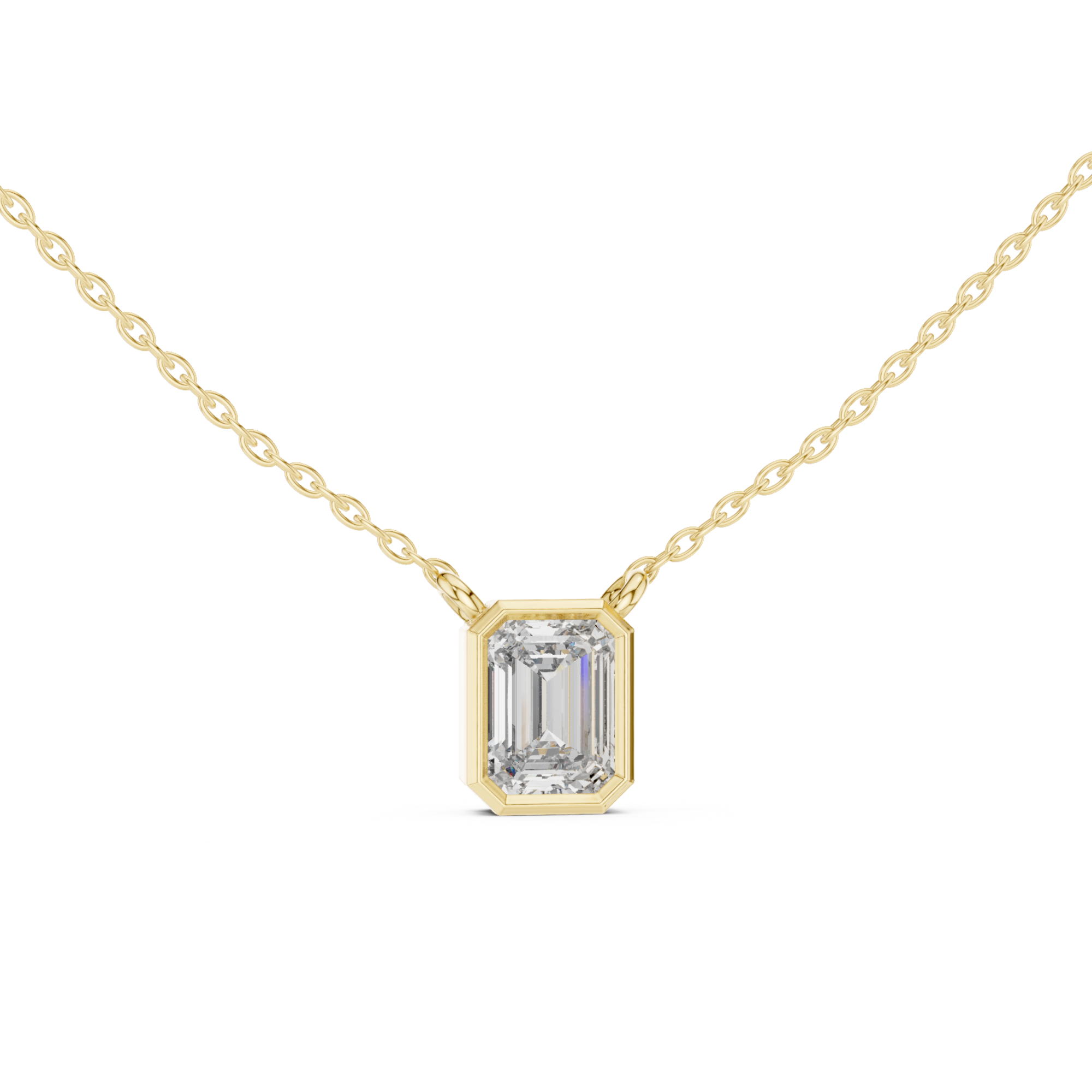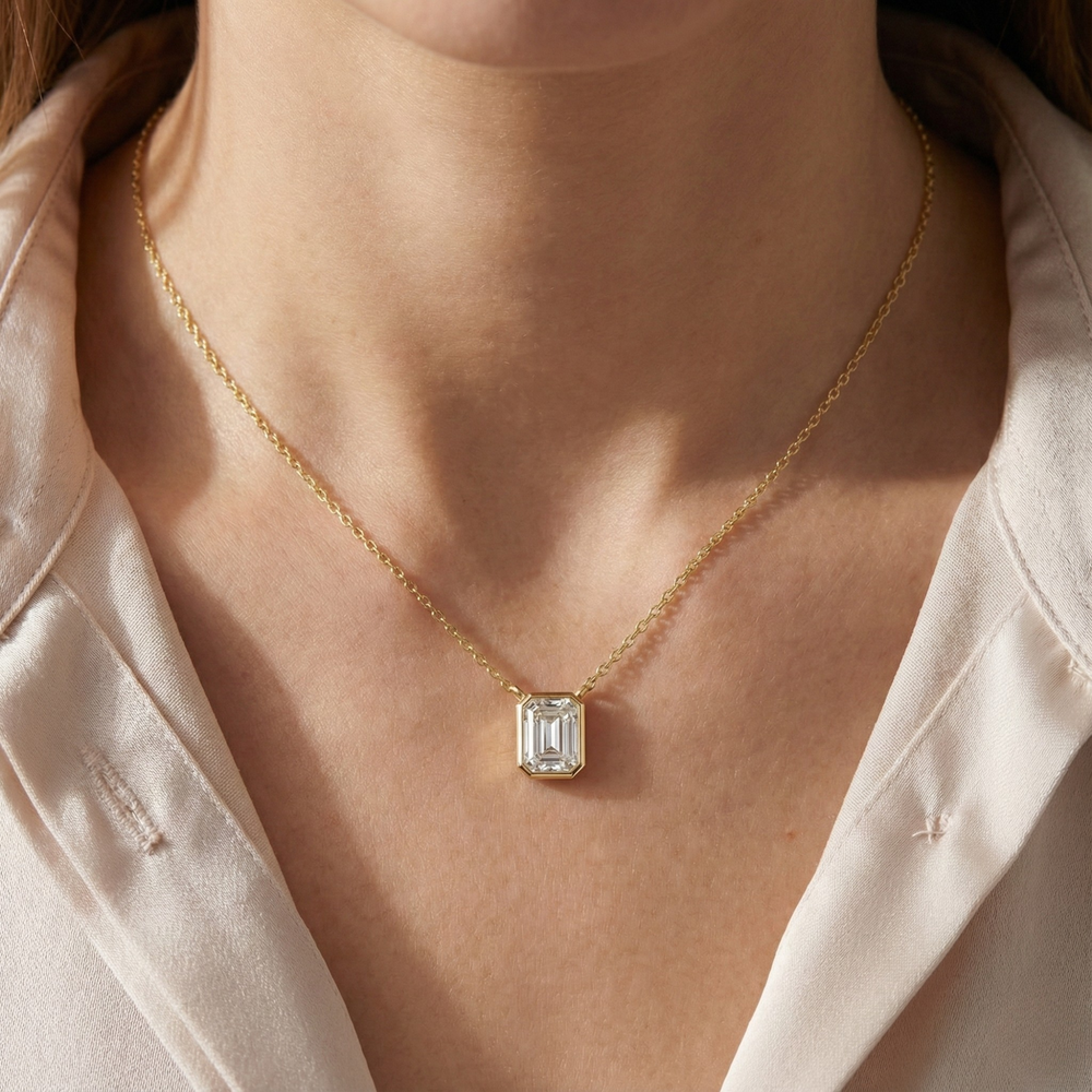 Nova by Jewel Nests showcases an IGI-certified emerald cut lab grown diamond with E/F color and VS-VVS clarity, securely encased in a unique full bezel setting for this sophisticated bezel solitaire necklace. Paired with a solid gold chain (1.30–1.50 mm width, adjustable 16–20 inches) in 14K or 18K Yellow Gold, White Gold, or Rose Gold, this emerald bezel solitaire lab diamond necklace delivers step-cut clarity and certified contemporary protection.