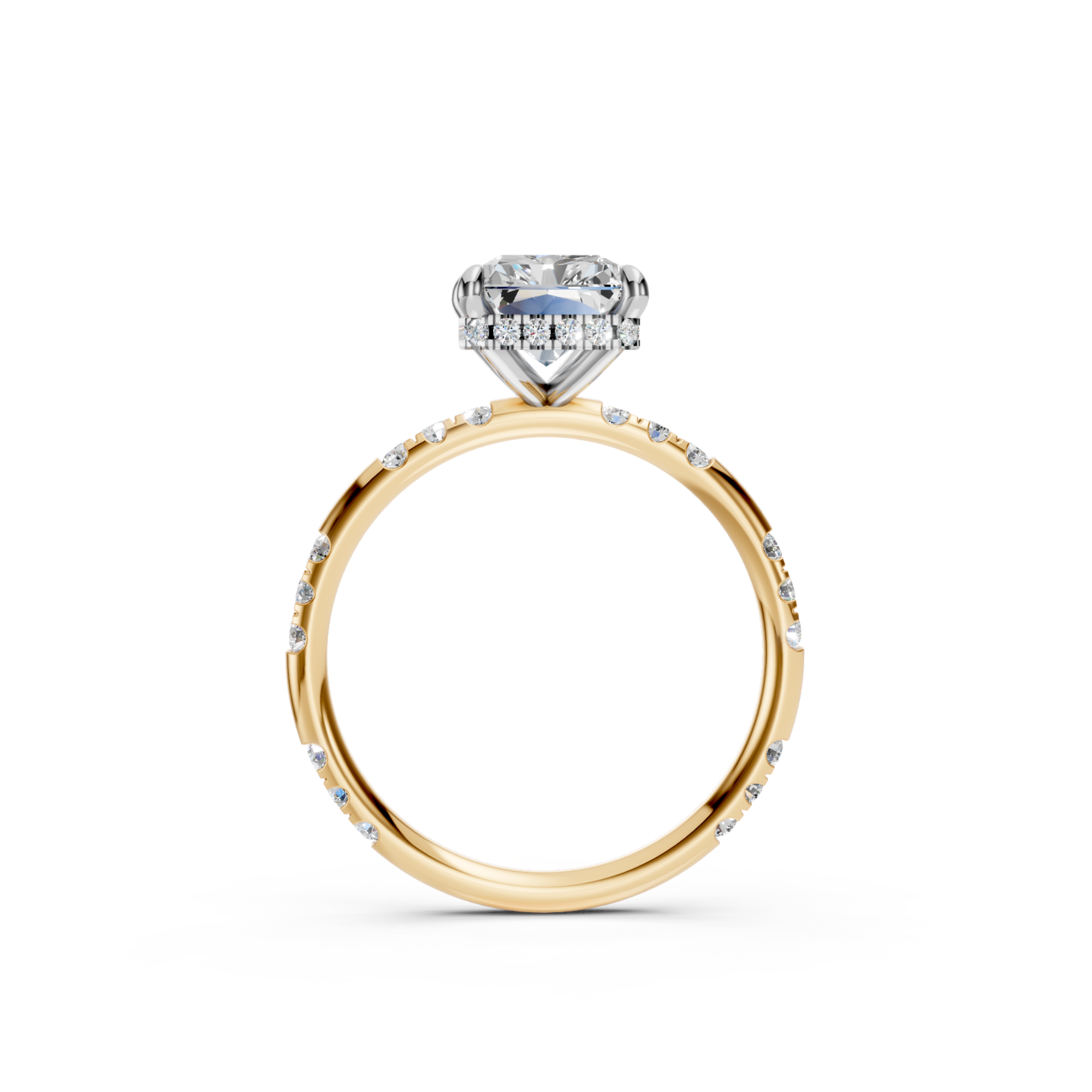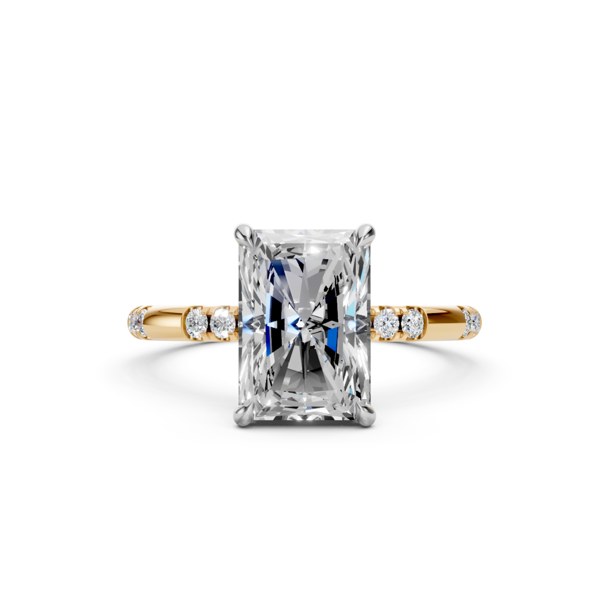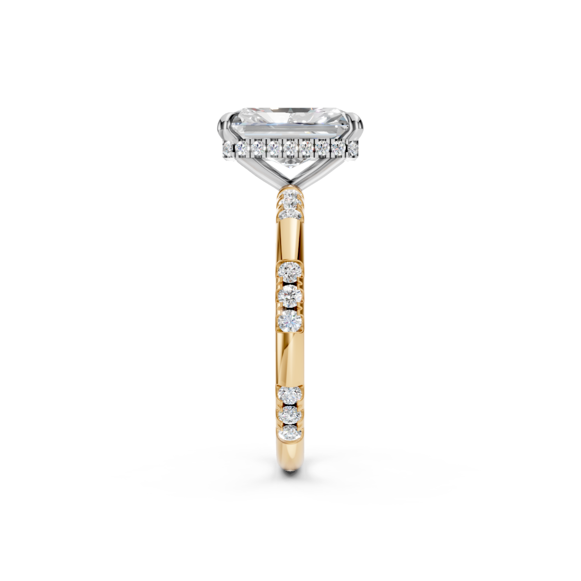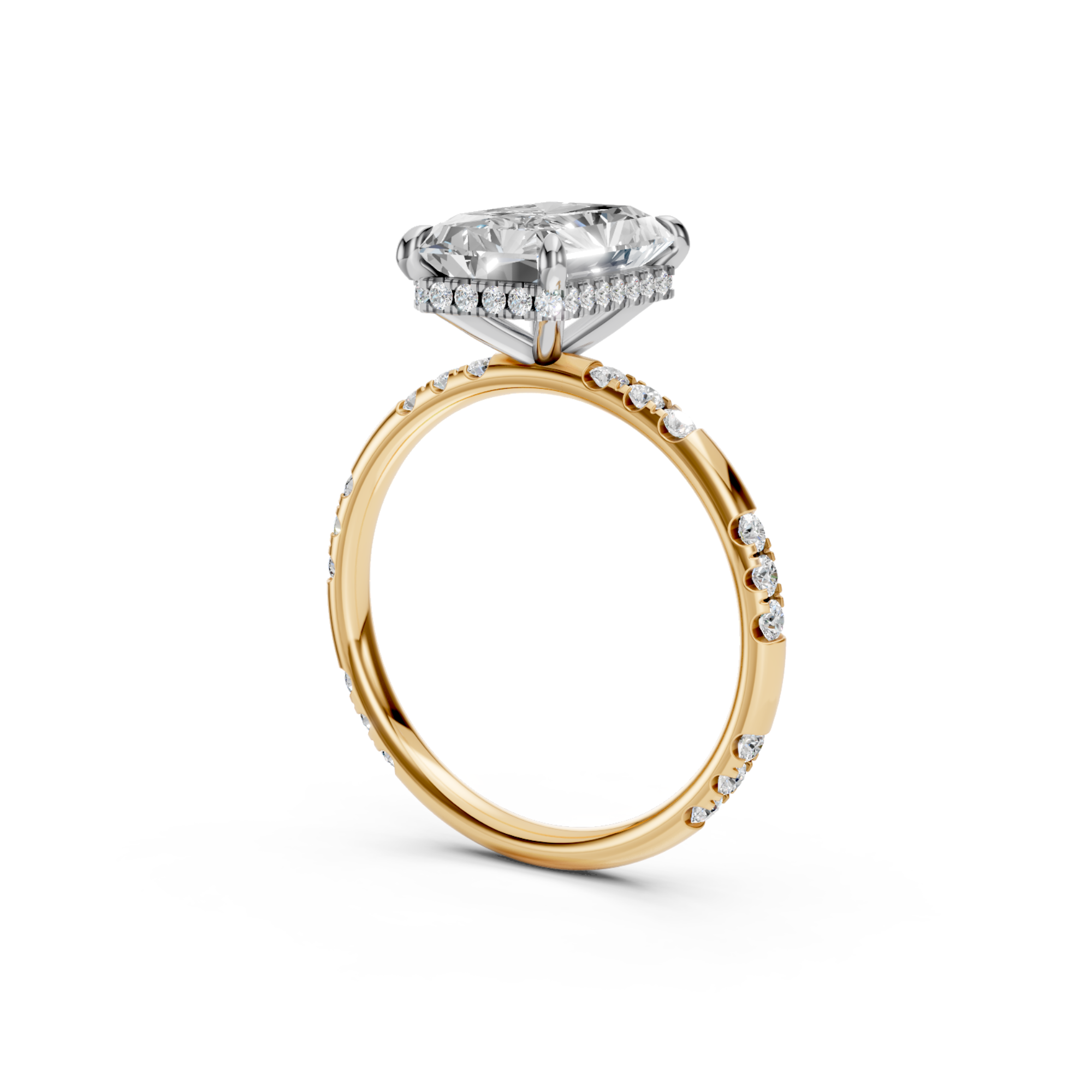 Radiant Cut Hidden Halo Lab Diamond Engagement Ring | Seville Grace by Jewel Nests embraces refined luxury and timeless sophistication, designed for couples across Canada and the United States who value ethical craftsmanship and elegance. This exquisite Hidden halo diamond ring showcases a certified Radiant cut lab grown diamond, perfectly set in a four-prong design that enhances its brilliance and refined geometry. The luminous hidden halo intensifies sparkle from below, while the 2.0 mm band, adorned with side round lab grown diamonds, adds delicate shimmer. The striking two-tone gold design creates a modern contrast, giving this ring an elevated look that exudes pure radiance.