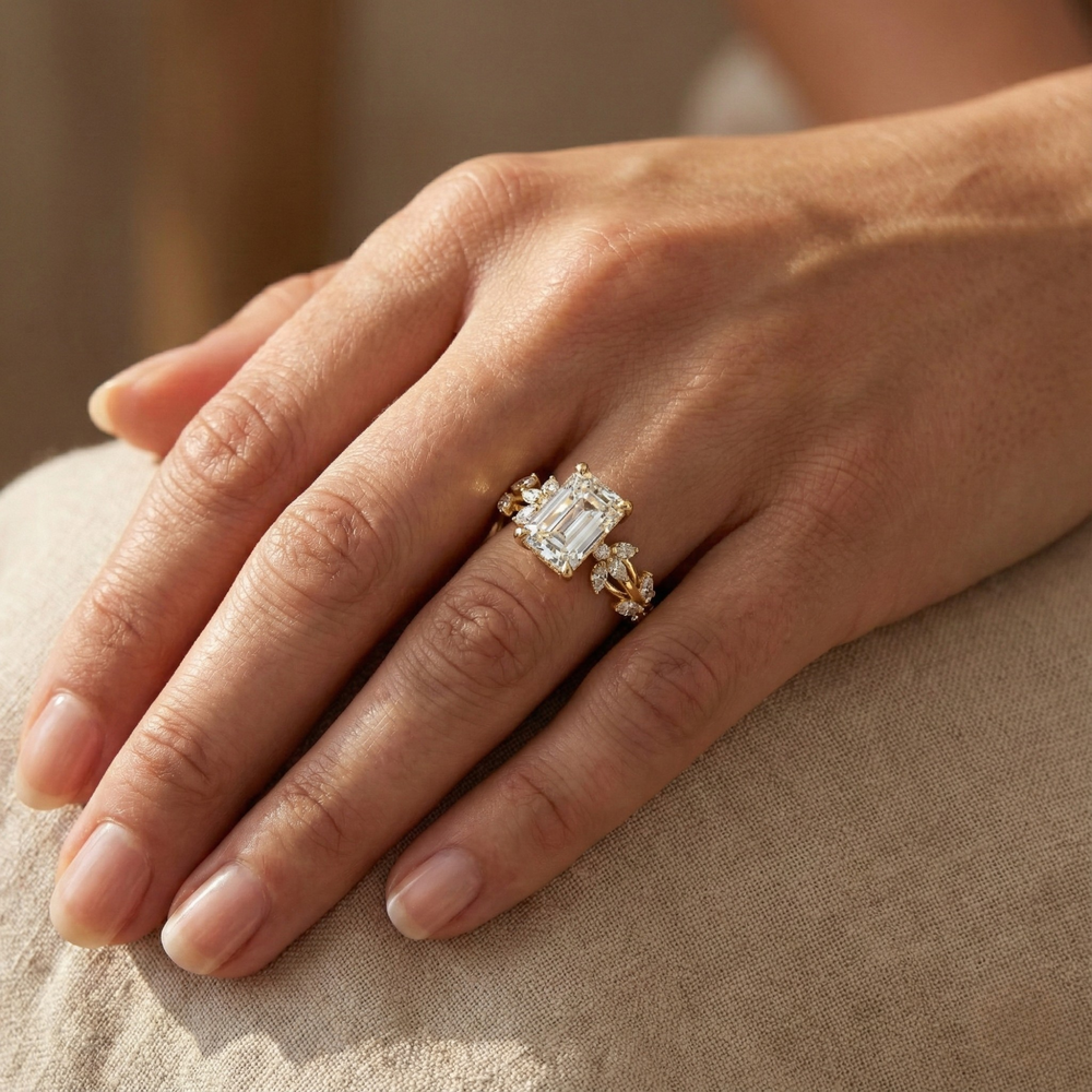 The Yukon Flow – Emerald Cut Lab Grown Diamond Hidden Halo Nature-Inspired Engagement Ring | 14K & 18K Gold | Jewel Nests