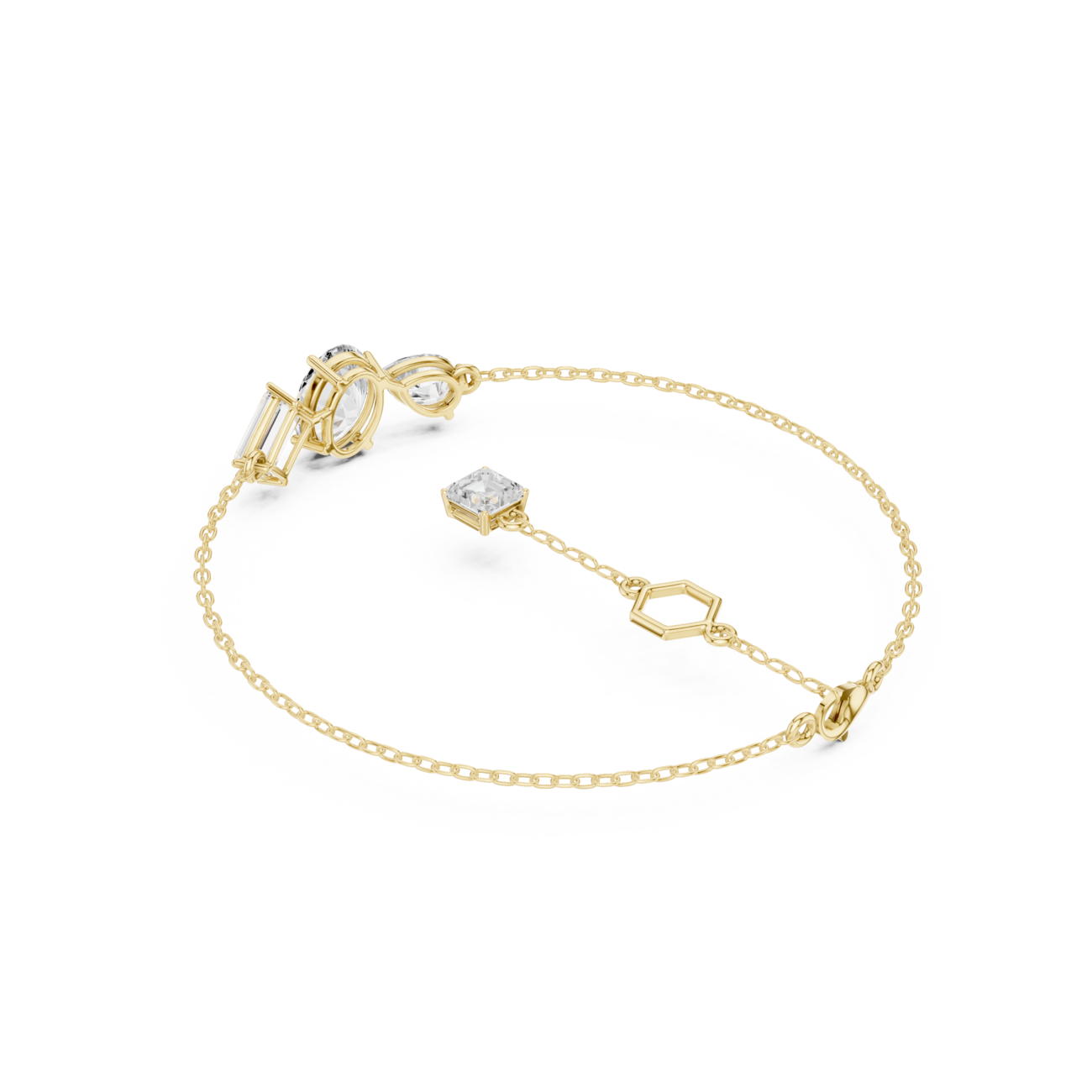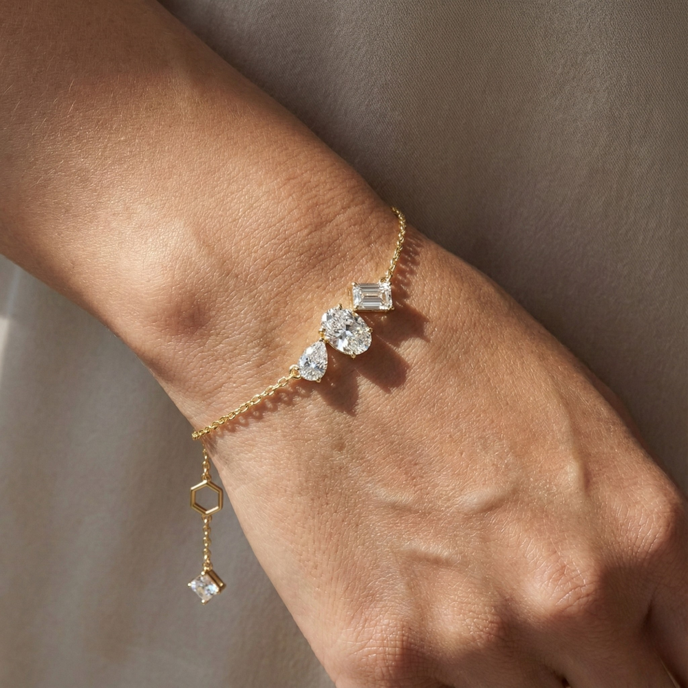 Three Stone Lab Grown Diamond Bracelet in 14K Solid Gold | Fiesta by Jewel Nests dazzles with three stunning center stones—a pear cut, oval cut, and baguette cut lab grown diamond totaling 3.25 carats in E/F color and VS-VVS clarity—plus an elegant drop Asscher cut diamond for extra sparkle, all enhanced by surrounding round lab grown diamonds of matching premium quality. This lab grown diamond bracelet features a secure lobster clasp and adjustable lengths of 6.0, 6.50, and 7.0 inches, available in 14k and 18k solid yellow gold, white gold, or rose gold to perfectly suit lab grown diamond bracelet Canada and lab grown diamond bracelet USA customers seeking Lab Diamond Bracelets with heirloom appeal. Ideal as a luxurious gift for mom, romantic gift for wife, Valentine gift diamond bracelet, or anniversary diamond bracelet, it elevates any collection with ethical, high-fire brilliance.